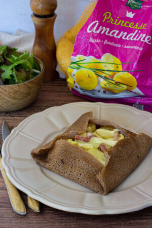 - Dans votre poêle, au milieu de la galette, déposer la garniture ainsi que les pommes de terre puis deux tranches fines de reblochon, replier le bas et le haut de la galette sur la garniture puis les côtés.