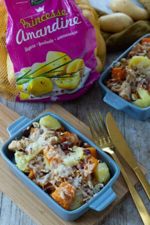 - Dans un plat à gratin ou des plats individuels, répartir les pommes de terre, le poulet, ajouter la sauce au chèvre et répartir le chèvre râpé.