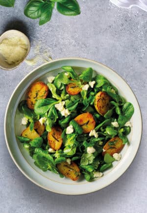 - Répartissez la mâche assaisonnée dans les assiettes puis disposez joliment dessus les pommes de terre et la feta.