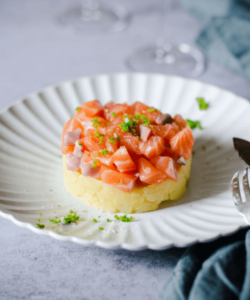 Ecrasé de pommes de terre et tartare de saumon au Combava